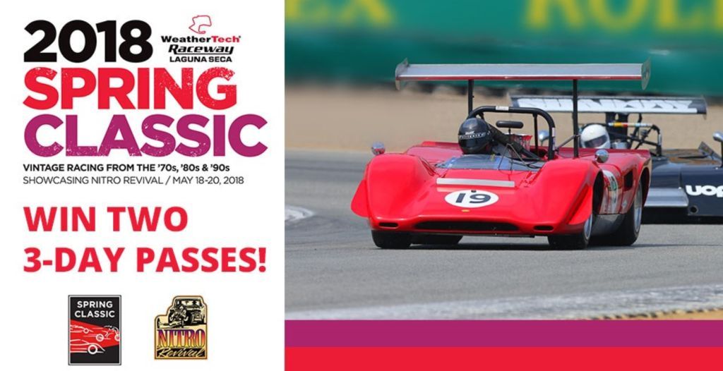 Register to win TWO 3-day passes to the WeatherTech Raceway Laguna Seca Spring Classic showcasing Nitro Revival May 18th, 19th, and 20th featuring vintage race cars, motorcycles, and dragsters from the 1960s, ’70s, and 80s.