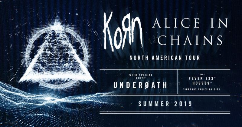 San Francisco, CA (February 25, 2019) – Hard rock legends KORN and ALICE IN CHAINS have announced an epic co-headline amphitheater tour across North America this summer. Underoath will join as special guest with FEVER 333. Produced by Live Nation, the 30-city outing will kick off July 18th and wrap on September 4th in Mountain View, CA at Shoreline Amphitheatre.