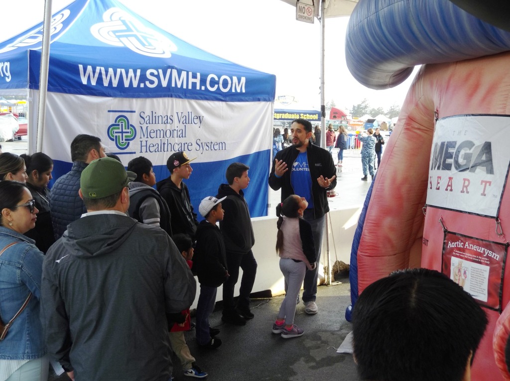 Even though children and teens usually don’t show the symptoms of heart disease, the silent buildup of plaque (fatty deposits) can start in childhood and can have a serious impact on their adult life. One of Salinas Valley Memorial’s dedicated volunteers at the MEGA Heart exhibit, James Lewis, a Clinical Exercise Physiologist, talked to the young children about the importance of cardiac wellness in terms that were easy to understand and put in to practice by explaining how to avoid the heart from overworking by doing simple things such as eating healthy foods and exercising regularly, because as he mentioned, “the heart is already working too hard already”.