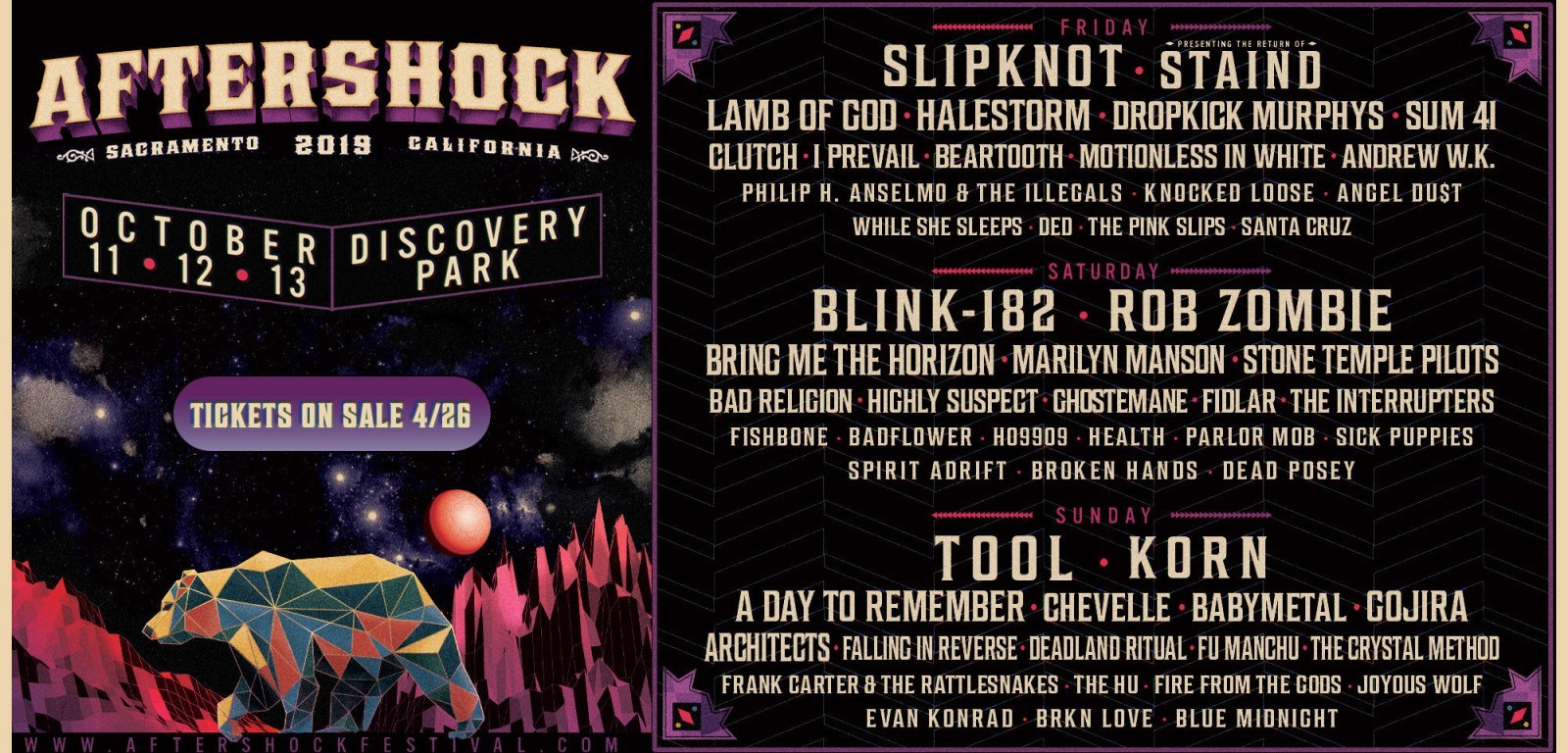 After welcoming a sold-out crowd of 60,000 people in 2018, Aftershock returns even bigger this year, expanding to three full days of performances from some of the most popular music acts, including a mix of chart-topping headliners and up-and-coming buzzworthy bands across the rock spectrum. The eighth annual edition of California’s biggest rock festival takes place Friday, October 11, Saturday, October 12 and Sunday, October 13 at Discovery Park near downtown Sacramento, CA, and is produced by premier independent festival producer Danny Wimmer Presents.