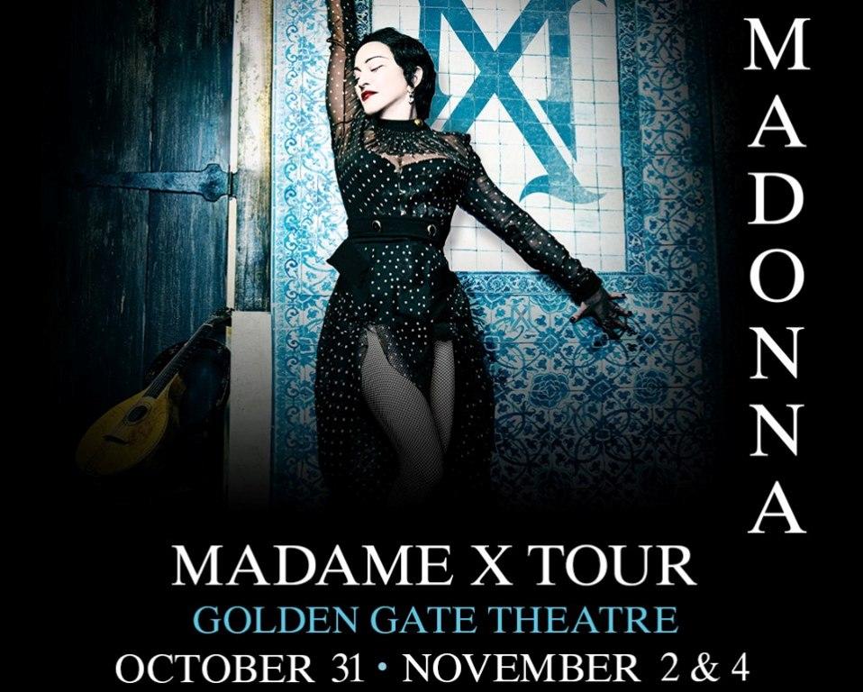 San Francisco, CA (September 9, 2019) – Live Nation is pleased to announce that the Madonna Madame X tour has been confirmed for three concerts at the Golden Gate Theatre in San Francisco – October 31, November 2 and November 4. These will be the only area dates and tickets will go on general sale this Friday, September 13th (10am local times) at https://madamex.shnsf.com.