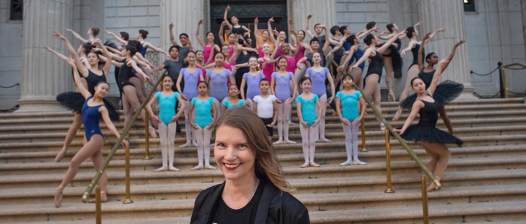 New Ballet Director Dalia Rawson in front of the Corinthian Ballroom with some of New Ballet’s students. Photo Credit: Daniel Garcia