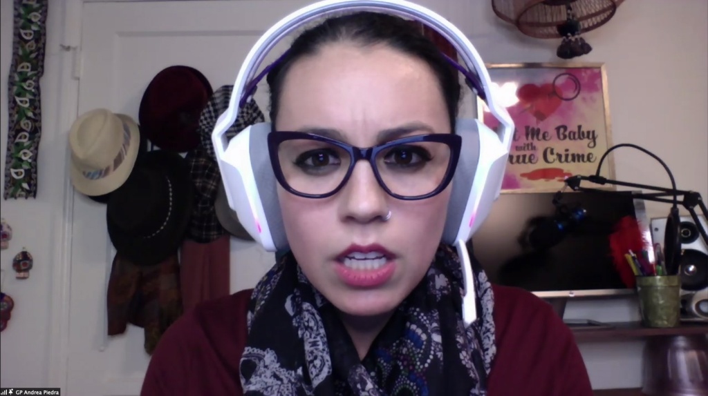 La anfitriona del teatro virtual, Anya, da la bienvenida y presenta a cada persona, a menudo compartiendo datos interesantes descubiertos en la encuesta de la persona. Justo antes de que comenzara el programa, Anya permitió que apareciera un participante más en un marco de Zoom. Usando audifonos blancos brillantes, determinamos inmediatamente que ella está familiarizada con Anya y McKittrick. Ella bromea una y otra vez durante su presentación, diciendo que le envió un mensaje de texto a McKittrick antes del programa, pero que él no respondió. Su nombre en Zoom es Andrea (Paloma Nozicka), e irritantemente se activa a menudo, interrumpiendo e interrumpiendo a McKittrick después de que aparece en pantalla.