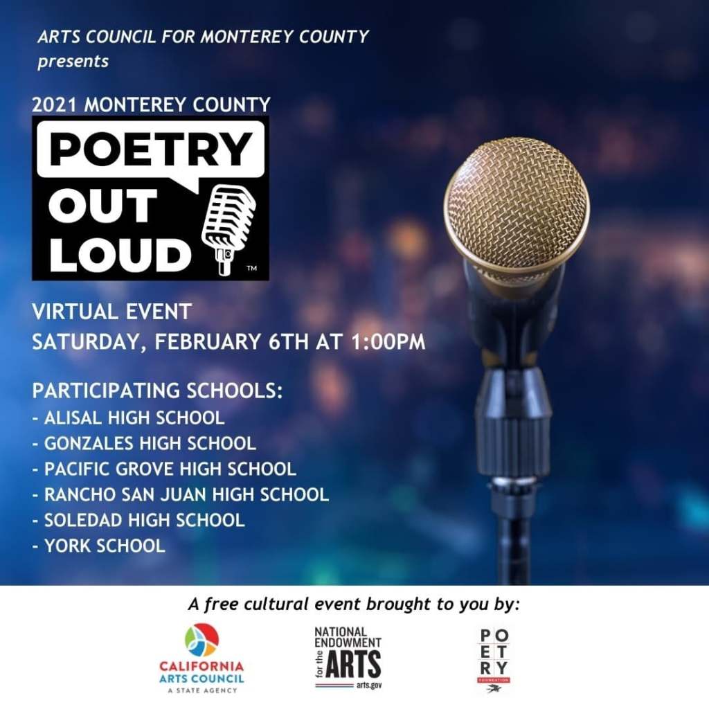 This Saturday, February 6th watch High School students compete virtually for the Monterey County Poetry Out Loud Champion title! The virtual showcase will feature poetry recitation from 6 local high school students. Winners will be announced at the end of the show.Please mark yourself as ‘Going’ and support our local high school students. The County winner will move on to compete in the California Poetry Out Loud Finals in March 2021.