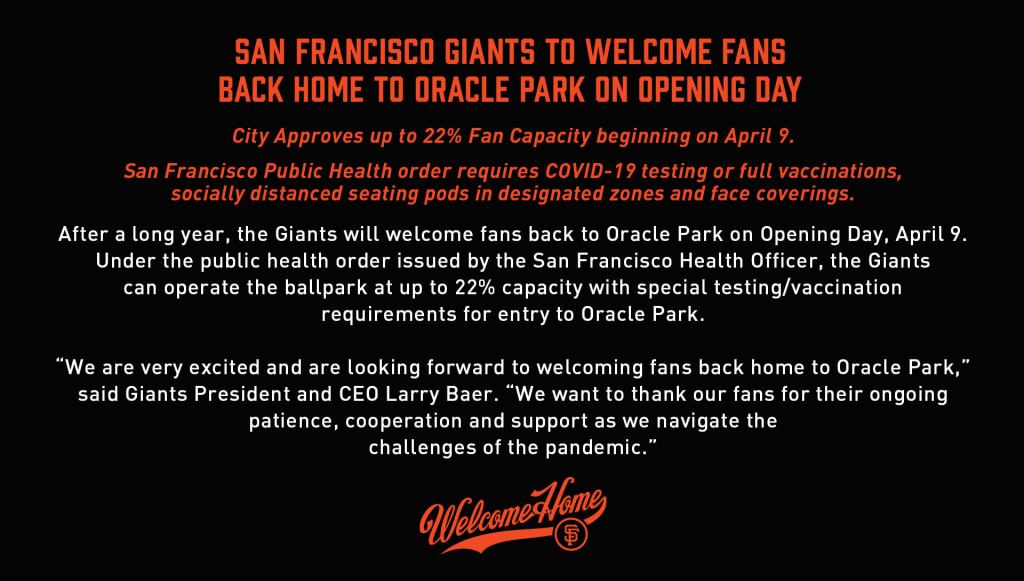 After a long year, the Giants have been approved to welcome fans back home to Oracle Park starting on Opening Day, April 9. The San Francisco Public Health Department has approved our application to host fans and is allowing us to operate the ballpark at up to 22% of its capacity.