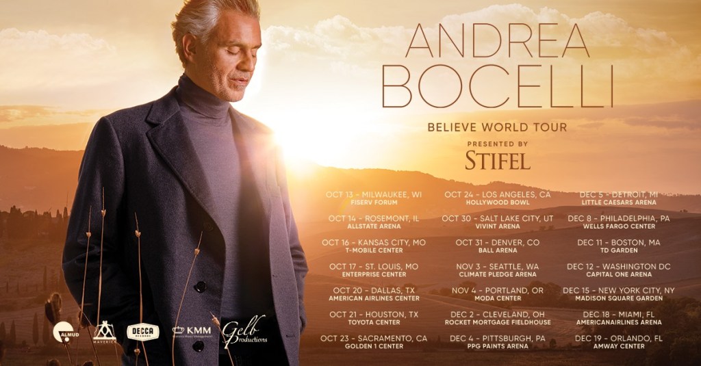 World-renowned Italian tenor Andrea Bocelli announced his Believe North American Tour, supporting his latest album of the same name. Bocelli’s 21-city tour kicks off Wednesday, October 13, in Milwaukee, WI with stops at the historic Hollywood Bowl in Los Angeles on Oct. 24, his first performances ever in Kansas City and St. Louis, MO as well as a notable performance at Madison Square Garden in New York. For the entire routing, please see dates listed below. Tickets go on sale to the general public on Monday, May 3 at 10 a.m.