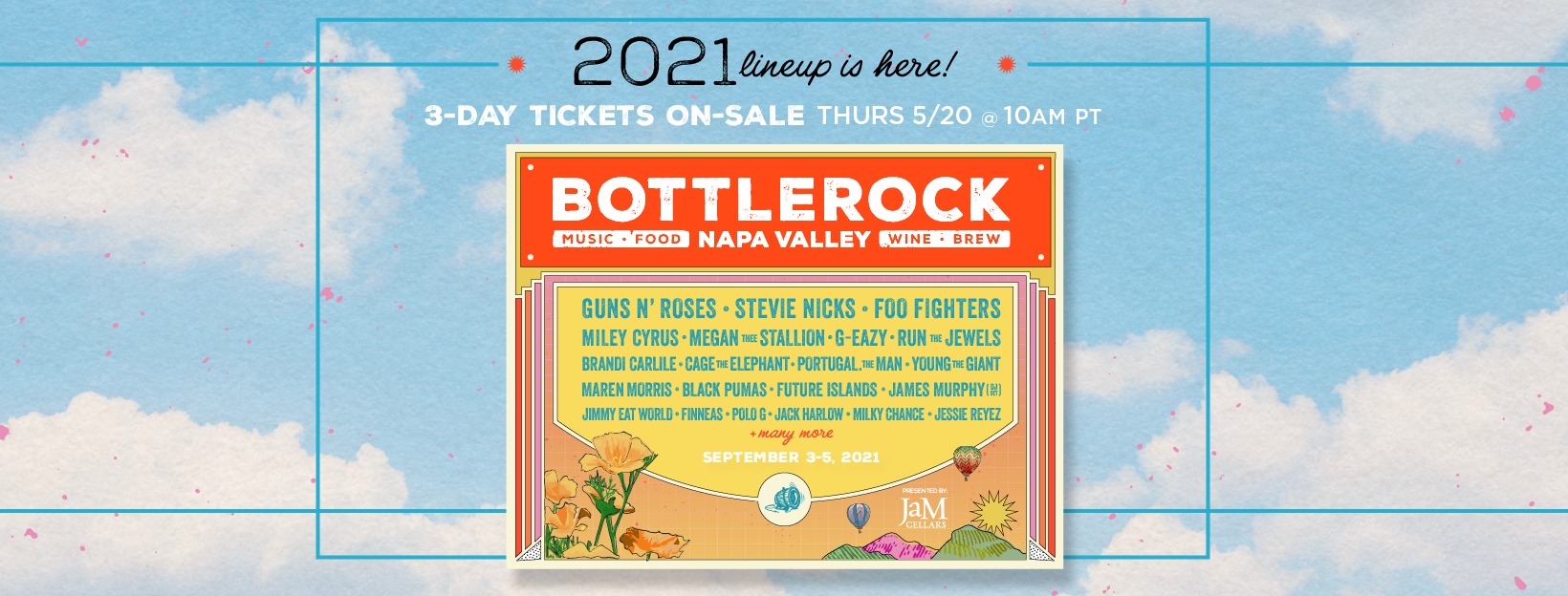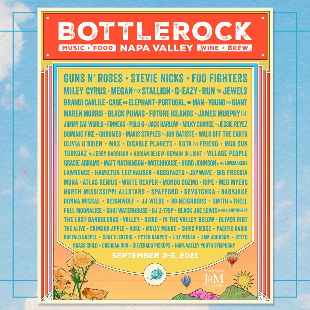 BottleRock Napa Valley, presentado por JaM Cellars, ha anunciado el cartel para el regreso de 2021 del festival propiedad de Live Nation. Desde el fin de semana del Día de los Caídos hasta el Día del Trabajo, el cartel de este año está repleto de cabezas de cartel como Guns N ’Roses, Stevie Nicks, Foo Fighters y cuenta con una gran cantidad de talentos musicales que incluyen a Miley Cyrus, Megan Thee Stallion, G-Eazy y Run The Jewels.