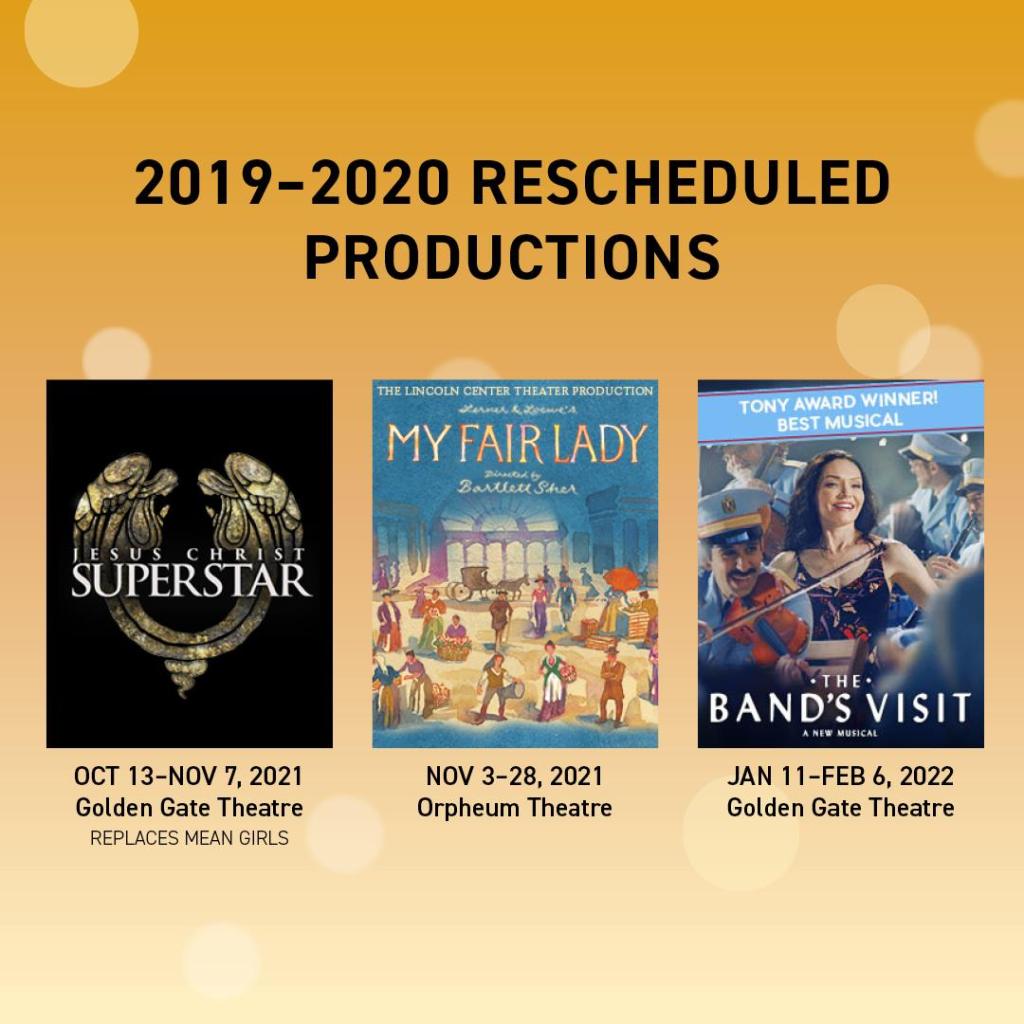 BroadwaySF ha anunciado su regreso en Octubre con la obra Jesus Christ Superstar en el Golden Gate Theatre. La obra My Fair Lady on Broadway está confirmada para Noviembre en el Orpheum Theatre y The Band’s Visit está confirmada para Enero-Febrero del 2022 en el Golden Gate Theatre.