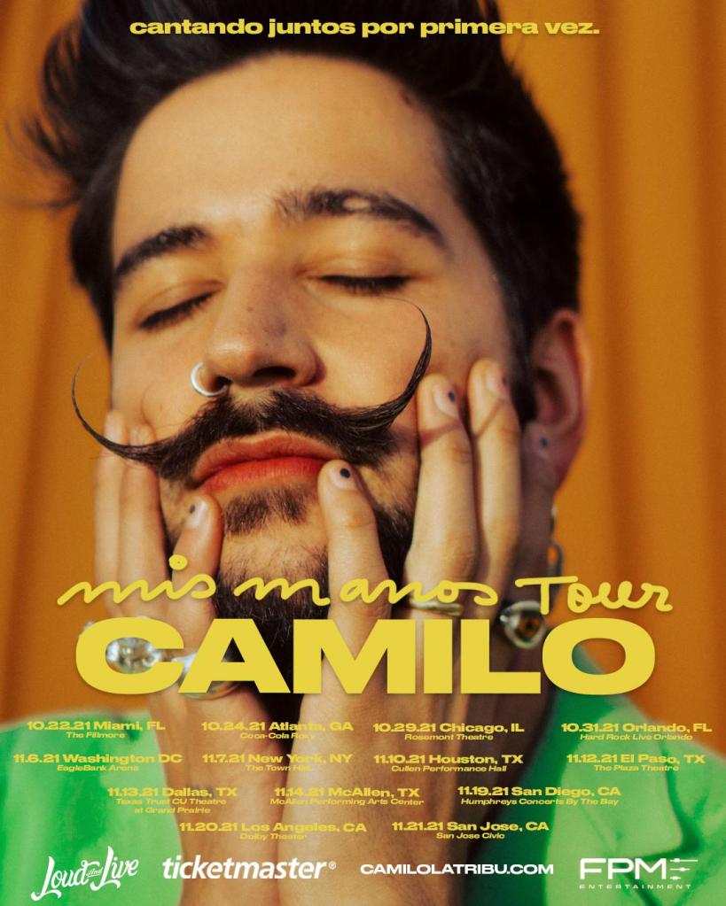 Miami, FL. 21 de mayo de 2021. Tras dominar las listas de venta, streaming y radio con múltiples éxitos desde su debut en 2019, el admirado cantautor, músico y productor colombiano Camilo presentará su esperado “Mis Manos Tour” en más de 13 ciudades de Estados Unidos a partir de octubre, 2021. .Antes de llegar este país, “Mis Manos Tour” dará inicio el próximo mes de julio en España, cuyos boletos salieron a la venta el pasado viernes y se agotaron en menos de seis horas. Un hecho sin precedentes siendo esta la primera gira en la exitosa carrera de Camilo, lo que representa algo sumamente especial para él y La Tribu, su legión de fans, que ha esperado dos años para verlo en vivo.