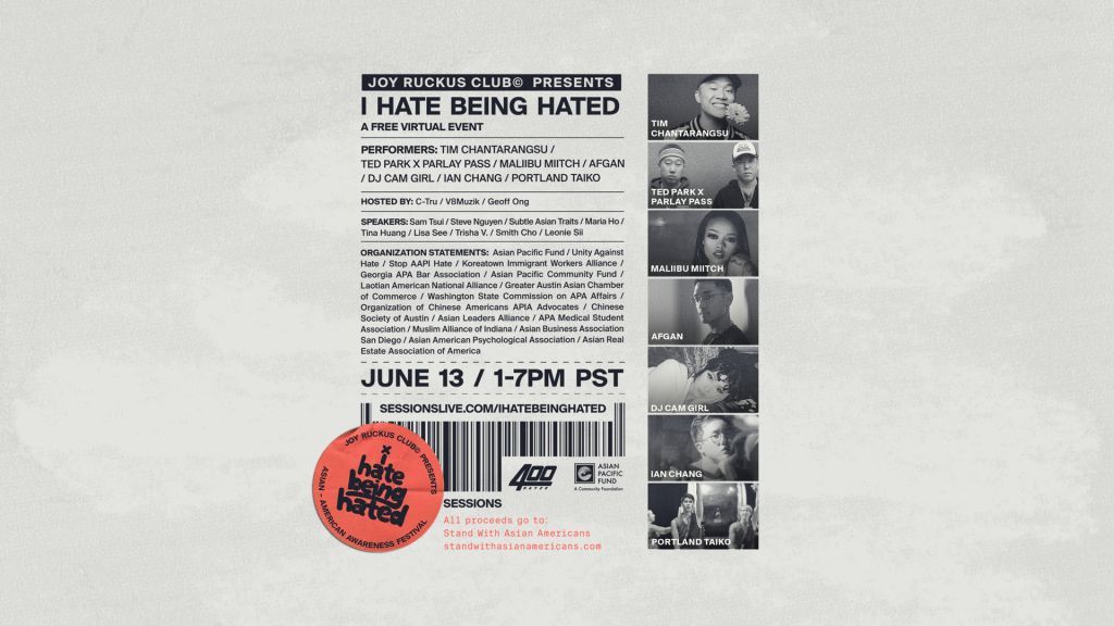 Sessions takes great pride in continuing their partnership with Joy Ruckus Club, the largest Asian music festival in the world, and virtual events promoter 400 Dayze to present I Hate Being Hated, an important fundraiser to benefit Stand with Asian Americans and to raise hate crime awareness on Sunday, June 13, 2021 at 1PM PST via sessionslive.com/ihatebeinghated. The event is free to stream, but audiences are encouraged to make donations of $35, $50, or $100 through the festival’s merch store on Sessions. All proceeds from the event will be donated to Stand with Asian Americans, a powerful network of the most accomplished Asian Americans in business and technology with Asian Pacific Fund as their philanthropic partner.
