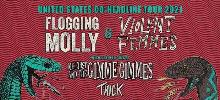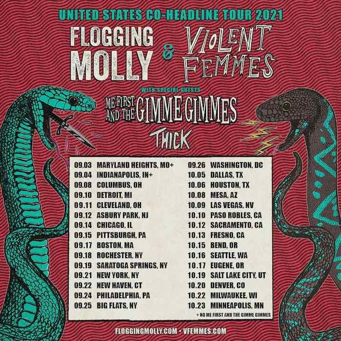 June 22, 2021 – Los Angeles, CA – Legendary punk bands Flogging Molly and Violent Femmes are excited to announce their upcoming fall co-headline tour, featuring special guests Me First And The Gimme Gimmes and Thick. Various pre-sales begin this week, with general tickets on-sale this Friday, June 25 at 10 am local time. For tickets and more information, please visit HERE.