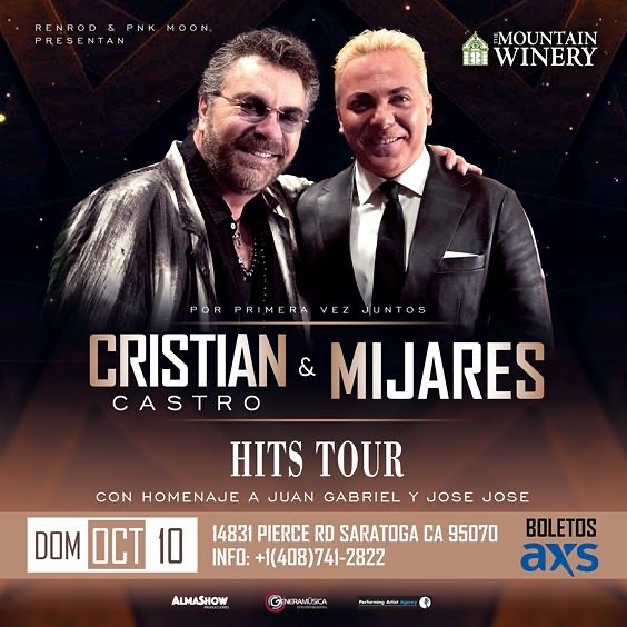 ¡CRISTIAN CASTRO & MIJARES presentan su “Hits Tour” con Homenaje a Juan Gabriel y José José en The Mountain Winery de Saratoga el domingo, 10 de octubre, 2021!