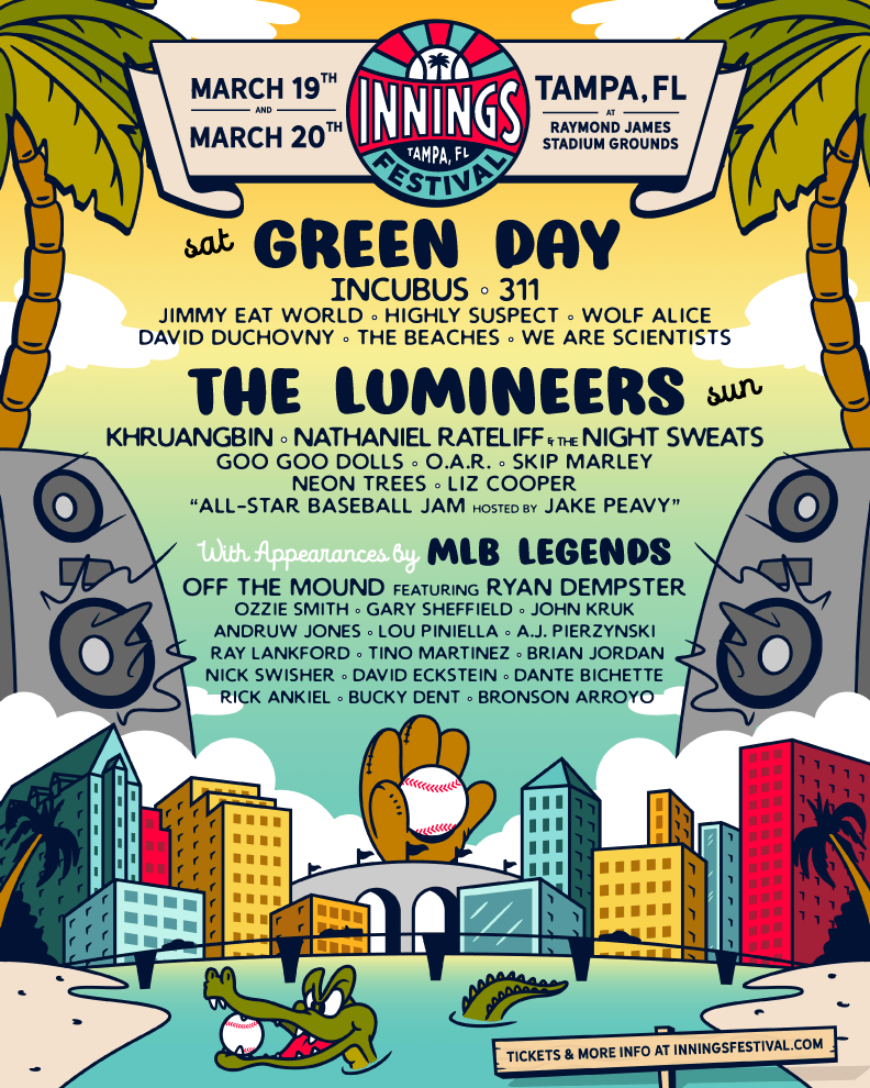Green Day and The Lumineers will headline the inaugural Innings Festival in Tampa, Florida, March 19-20 at Raymond James Stadium Grounds during Grapefruit League’s spring training. The two-day event will feature over fifteen artists on three stages, with no overlapping sets, and performances from Incubus, Khruangbin, 311, Nathanial Rateliff & The Night Sweats, Jimmy Eat World, Goo Goo Dolls, O.A.R., Highly Suspect and more, appearances by Major League Baseball greats including Ozzie Smith, Gary Sheffield, John Kruk, Lou Piniella, A.J. Pierzynski and more along with a live taping of “Off the Mound with Ryan Dempster,” an on-site talk show featuring MLB players and musicians, curated local fare, family friendly activities and more.