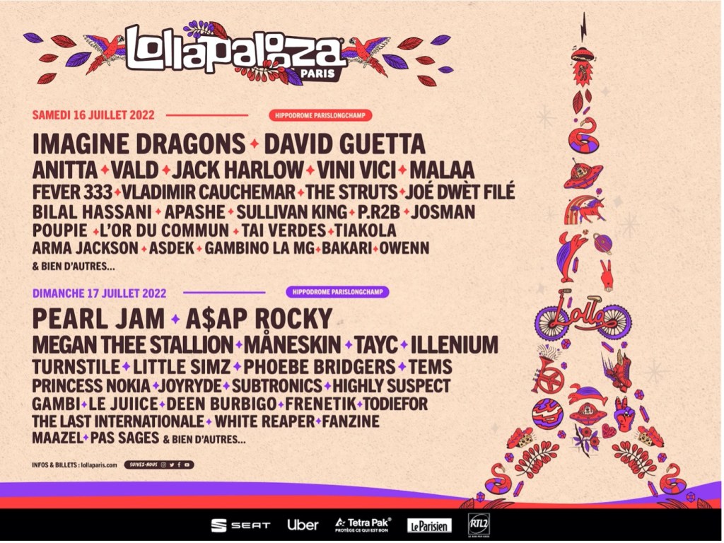 Pearl Jam, Imagine Dragons, A$AP Rocky and David Guetta will headline the fourth edition of Lollapalooza Paris, along with performances by Megan Thee Stallion, Anitta, Jack Harlow, Måneskin, Illenium, Turnstile, Phoebe Bridgers and many more. More than 50 artists will perform on four stages at Hippodrome De Longchamp on July 16-17, 2022. Tickets are on sale now at www.LollaParis.com.
