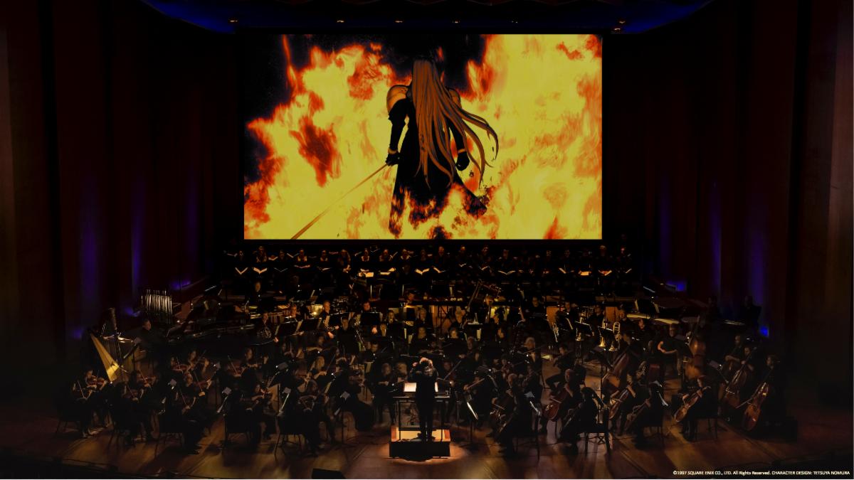 Program features music by composer Nobuo Uematsu and others performed live while video from game series FINAL FANTASY is projected onto a large screen above the stage