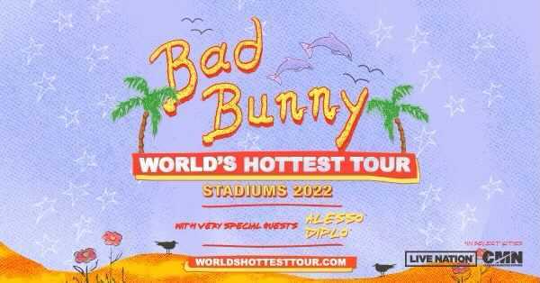 Proclaimed the most listened-to artist in the world for a second consecutive year by Spotify, Bad Bunny has distinguished himself for his revolutionary moves that constantly impact the music industry. Today, the multi-award-winning artist adds a new milestone to his career, announcing his first stadium tour “Bad Bunny: World’s Hottest Tour” across the United States and Latin America. Promoted by Live Nation and CMN in the U.S., the tour kicks off on August 5th at Camping World Stadium in Orlando, FL, making stops in Miami, Chicago, New York and many more before wrapping at SoFi Stadium in Los Angeles on September 30th, then heading out to Latin America in October. Tickets for this stadium tour will go on pre-sale beginning Wednesday, January 26 at 12pm local time. Subsequently, they will go on sale to the general public beginning Friday, January 28 at 12pm local time on worldshottesttour.com.