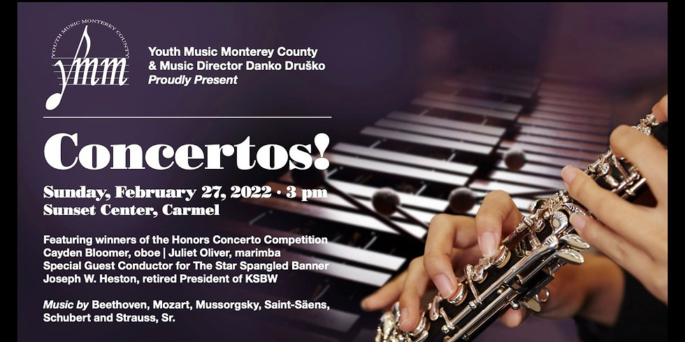 Featuring winners of the Honors Concerto Competition Cayden Bloomer, oboe & Juliet Oliver, marimba. Special Guest Conductor for The Star Spangled Banner Joseph W. Heston, retired President of KSBW. Music by Beethoven, Mozart, Mussorgsky, Saint-Säens, Schubert and Strauss, Sr.