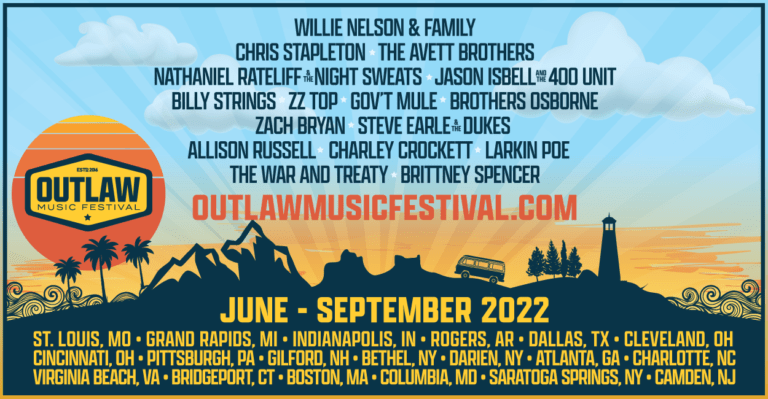Willie Nelson, Mark Rothbaum, Keith Wortman, Blackbird Presents, Live Nation, and the Outlaw Music Festival Tour are thrilled to be back on the road again. Willie will be live and in concert with his family and friends, including Willie Nelson & Family, Chris Stapleton, The Avett Brothers, Nathaniel Rateliff & The Night Sweats, Jason Isbell and the 400 Unit, Billy Strings, ZZ Top, Gov’t Mule, Brothers Osborne, Zach Bryan, Steve Earle & The Dukes, Allison Russell, Charley Crockett, Larkin Poe, The War and Treaty, Brittney Spencer, Particle Kid and more as part of the 20+ stop tour starting this summer. (For artists performing in various cities, please refer to the specific market lineups listed below.)