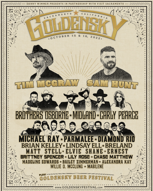 A spectacular lineup of top country music artists has been announced for GoldenSky Country Music Festival on Saturday, October 15 and Sunday, October 16, 2022 at Discovery Park in Sacramento, CA. Headliners Tim McGraw (Saturday) and Sam Hunt (Sunday) lead the all-star lineup which will also feature Brothers Osborne, Midland, Carly Pearce, Parmalee, Michael Ray, Diamond Rio, Brian Kelley, Lindsay Ell and many more.