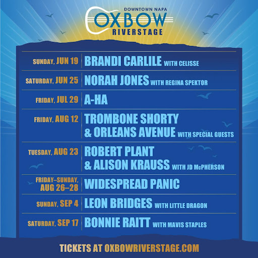 This year’s concert series at Oxbow RiverStage marks the venue’s first full season and will kick off on June 19 with Brandi Carlile. Other artists confirmed thus far are Norah Jones with special guest Regina Spektor on June 25, A-HA July 29, a Voodoo Threauxdown with Trombone Shorty & Orleans Avenue August 12, Robert Plant & Alison Krauss with JD McPherson August 23, Widespread Panic for three nights on August 26, 27 & 28, Leon Bridges on September 4 and Bonnie Raitt with Mavis Staples on September 17. Look for more enticing shows to be announced soon.