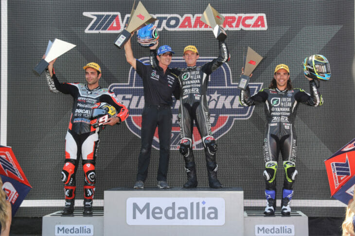 Aunque el podio fue el mismo que en la primera carrera de ayer, los resultados fueron diferentes con Danilo Petrucci de Warhorse HSBK Racing Ducati NYC superando al compañero de equipo de Gagne, Cameron Petersen, en la segunda carrera, ambos terminaron segundo y tercero, respectivamente.