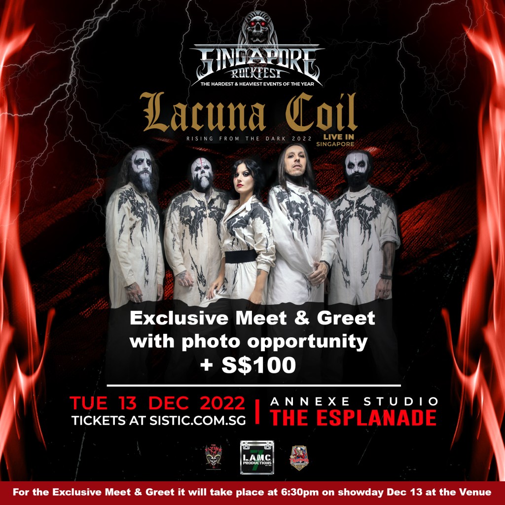 Avail of Lacuna Coil’s exclusive Meet & Greet on 13 December, just before the RISING FROM THE DARK 2022 show at the Esplanade Annexe Studio. Tickets are available at sistic.com.sg/events/lacuna1222.