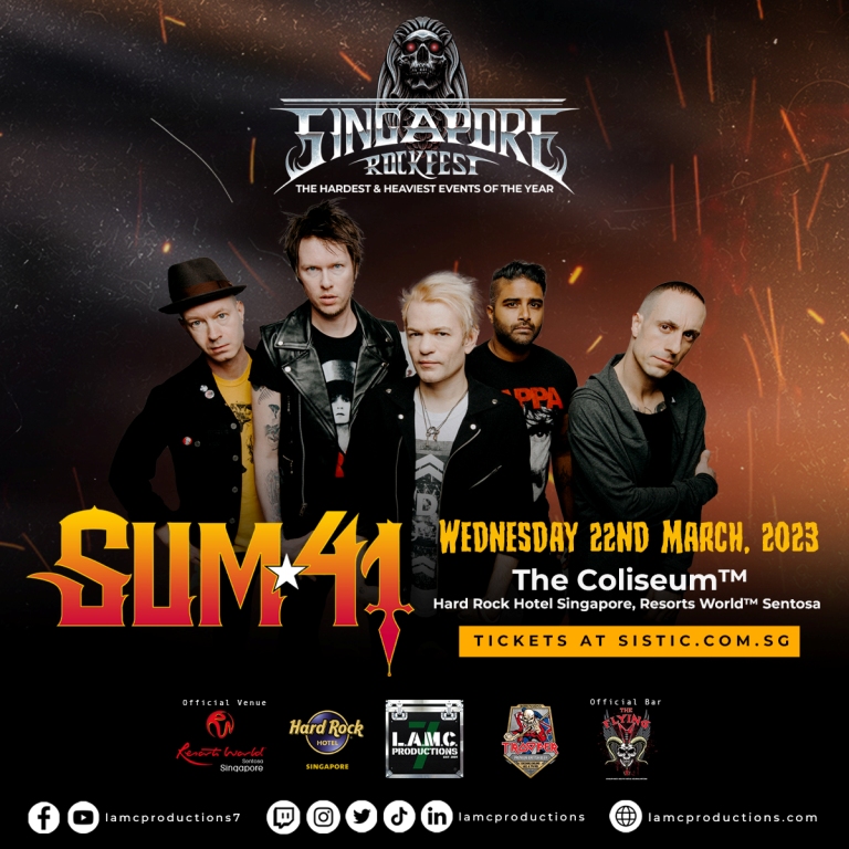 Alternative punk rockers Sum 41 are bringing their frenetic energy to Singapore! Catch Sum 41 on 22 March 2023 at The Coliseum™, Hard Rock Hotel Singapore, Resorts World™ Sentosa as part of the Singapore Rockfest Concert Series. Tickets on sale FRIDAY, 27 JANUARY, 10am at Sistic.