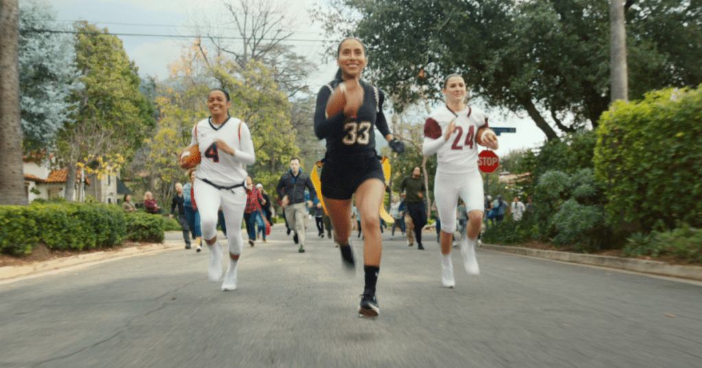 La mariscal de campo logra superarlos a todos con su impresionante velocidad y habilidad atlética, y cuenta con la ayuda de algunos íconos poderosos de su lado, incluida la leyenda del tenis BILLIE JEAN KING, la mariscal de campo del equipo nacional femenino de Flag Football de EE.UU. VANITA KROUCH y la primera jugadora de futbol americano con contrato NIL BELLA RASMUSSEN. El comercial termina con la frase: “Para las mujeres que impulsan el futbol americano, estamos ansiosos por ver a dónde llevan este juego”.