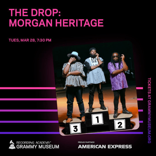 The Grammy Museum’s The Drop series with Morgan Heritage will be an intimate session featuring a stripped-down performance and an exclusive conversation with the culturally-iconic band, focusing on new music and activities for the year.