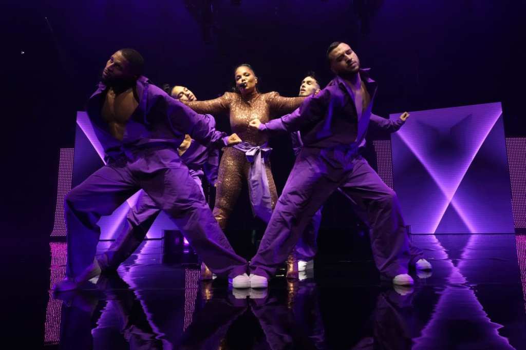 Emergió para revelar un traje dorado ceñido mientras ella y sus bailarines masculinos se sumergían en una versión pesimista de “Together Again” (remix de DJ Premier), oficialmente iniciando el espectáculo. Como ha sido el caso con las últimas giras de Jackson, ella adoptó un enfoque más simple es mejor.