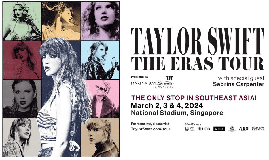 Taylor Swift | The Eras Tour in Singapore is presented by Marina Bay Sands and supported by the Singapore Tourism Board, official bank and presale partner UOB, and official experience partner Klook, promoted by AEG Presents Asia, and produced by Taylor Swift Touring. Singapore is the only stop in Southeast Asia.