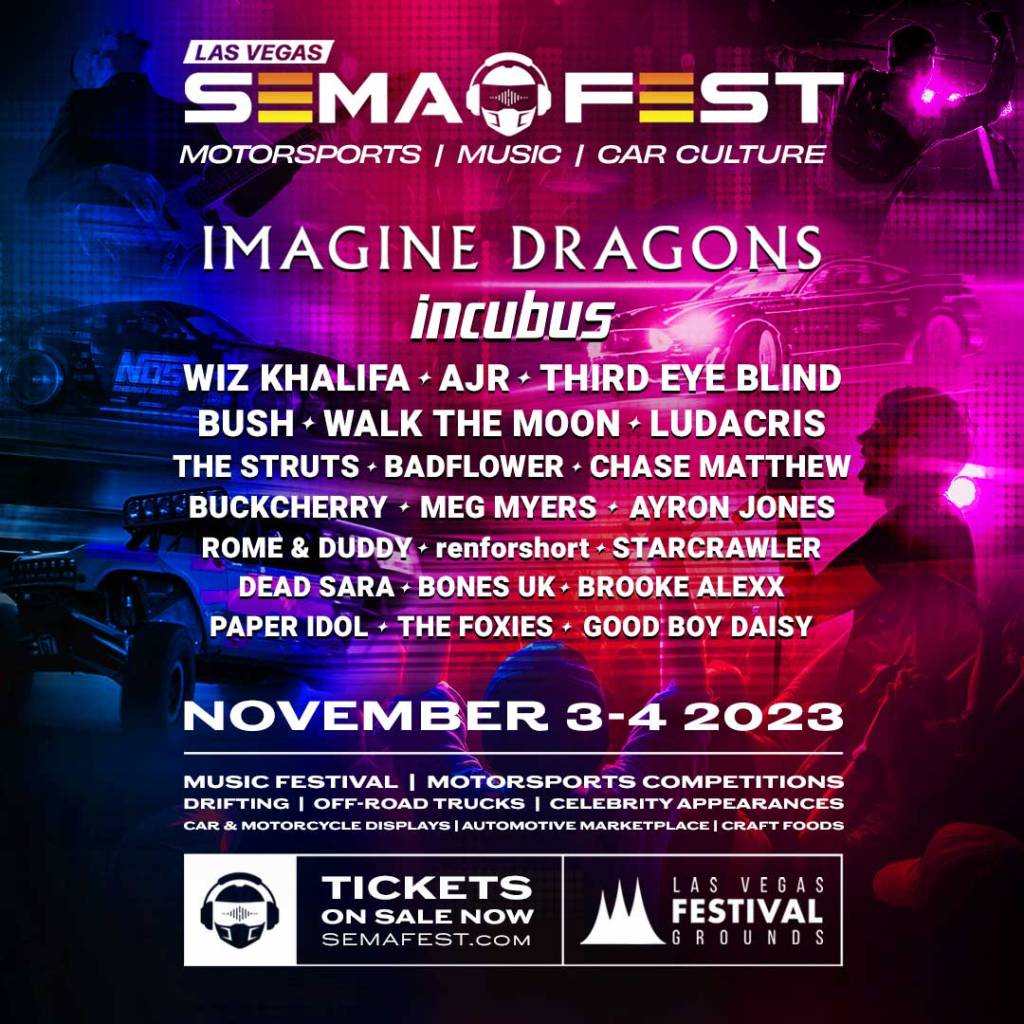 Los boletos para boletos para el primer SEMA Fes, un festival de dos días que fusiona la cultura automovilística y la música, ya están a la venta en www.semafest.com. Celebrado del 3 al 4 de noviembre en Las Vegas Festival Grounds en Las Vegas, Nevada, SEMA Fest es un evento imperdible abierto al público y con actos musicales de clase mundial Imagine Dragons, Incubus, Wiz Khalifa, AJR, Third Eye Blind, Bush, Walk The Moon y más.