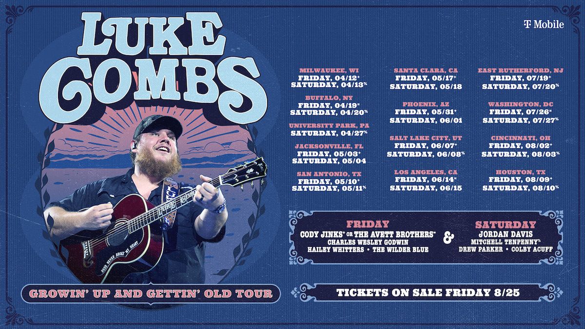 Reigning2x CMA Entertainer of the Year Luke Combs will perform 25 U.S. stadium shows next year with his “Growin’ Up and Gettin’ Old Tour.” Newly confirmed stops include two nights at New Jersey’s MetLife Stadium, Los Angeles’ SoFi Stadium, Jacksonville’s EverBank Stadium, Santa Clara’s Levi’s® Stadium, Houston’s NRG Stadium and Phoenix’s State Farm Stadium among many others. See below for complete itinerary. Special guests for the Friday night shows include Cody Jinks, The Avett Brothers, Charles Wesley Godwin, Hailey Whitters and The Wilder Blue, while the Saturday shows will feature Jordan Davis, Mitchell Tenpenny, Drew Parker and Colby Acuff.