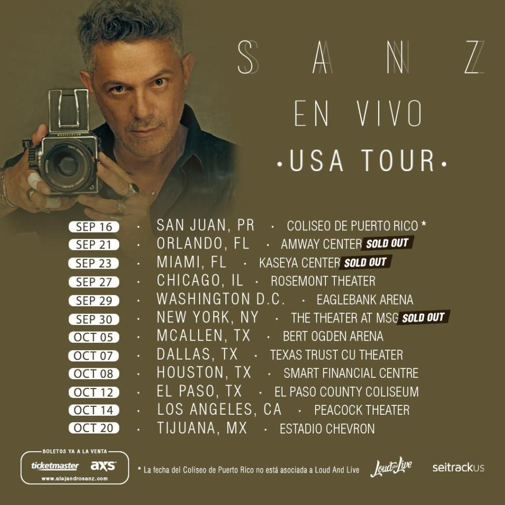 One week prior to starting his “SANZ EN VIVO” tour, Alejandro Sanz announces SOLD OUT shows in Orlando, Miami and New York. Produced by Loud And Live, the tour will also hit major cities in the United States, including Chicago, Washington DC, McAllen, Dallas, Houston, El Paso and Los Angeles, in the months of September and October before continuing to Mexico on October 20 at the Chevron Stadium in Tijuana.