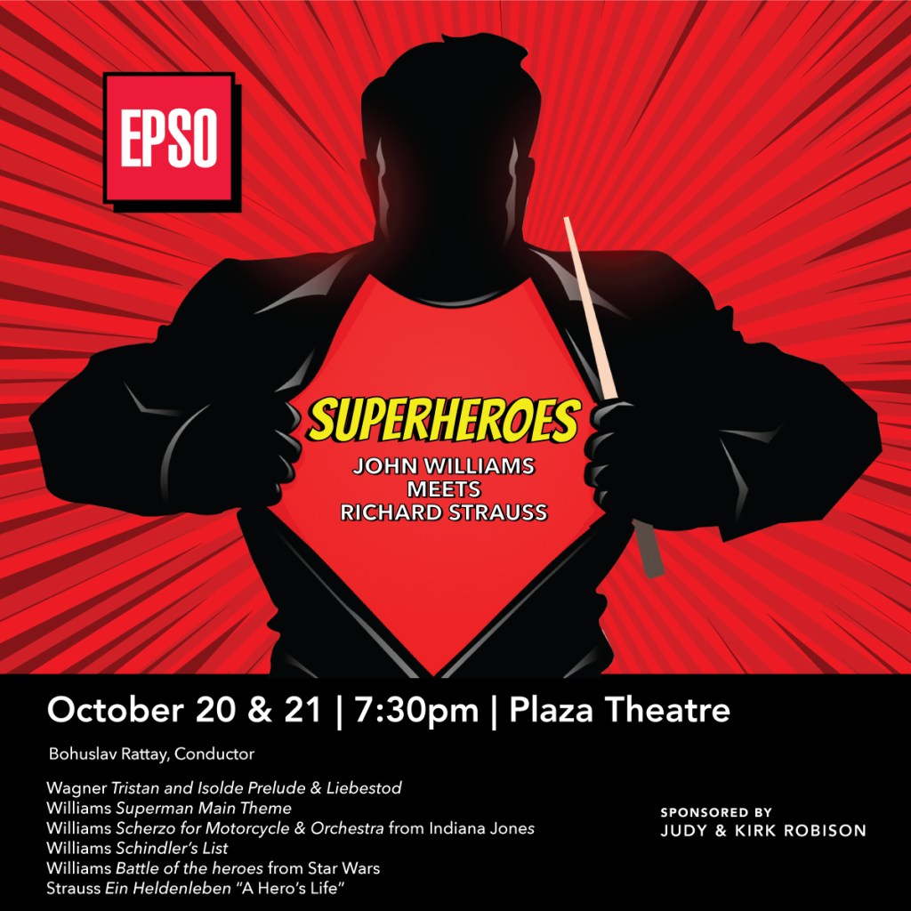 Sumérgete en la música de algunas de tus películas favoritas, incluyendo Superman, Indiana Jones y Schindler’s List en la presentación de “SUPERHEROES: JOHN WILLIAMS MEETS RICHARD STRAUSS” de El Paso Symphony Orchestra este viernes 20 y á 21 de octubre a las 7pm en el Plaza Theatre, ubicado en 125 Pioneer Plaza.