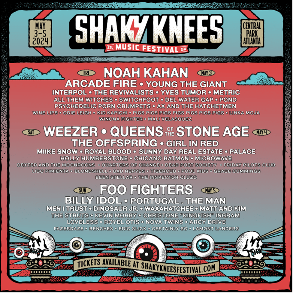 Foo Fighters, Queens of the Stone Age, Noah Kahan, and Weezer will headline the 2024 edition of Shaky Knees taking place May 3-5 at Central Park in downtown Atlanta. The stacked lineup, known for its impeccable rock curation, features over 60 artists across four stages including Queens of the Stone Age, Arcade Fire, Girl in Red, Billy Idol, The Offspring, Portugal. The Man, Young the Giant, Interpol and many more. Presale tickets are available starting Thursday, November 30th at 10am ET and fans can sign up now for the Presale passcode for the first and best chance to se cure 3-Day and 1-Day tickets at the lowest possible price. A general on sale will follow if tickets remain.