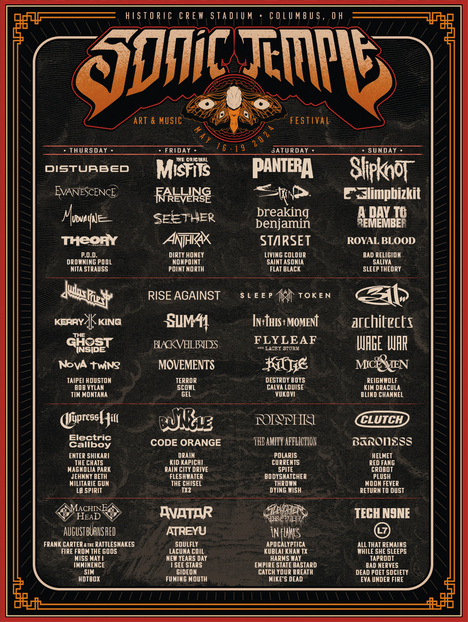 Headlining Sonic Temple Art & Music Festival are some of rock and metal’s biggest artists including Disturbed (Thursday), The Original Misfits (Friday), Pantera (Saturday) and Slipknot (Sunday). Additional performers include Evanescence, Limp Bizkit, Judas Priest, Staind, Breaking Benjamin, A Day To Remember, Falling In Reverse, Sleep Token, Rise Against, 311, Seether, In This Moment, Mudvayne, Cypress Hill, Sum 41, Kerry King, Mr. Bungle, Theory of a Deadman, Anthrax and many others. 120 bands in total will play across four stages for the first time in the festival’s history, also marking more stages and bands than ever before at an event at Historic Crew Stadium.