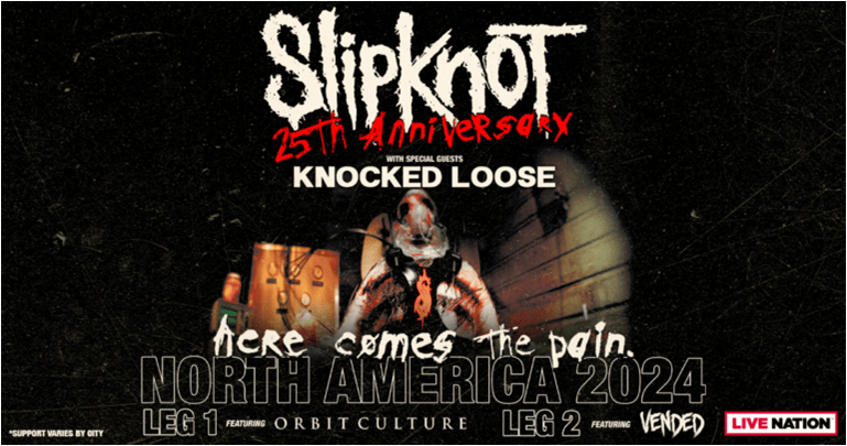 Los titanes pesados y el fenómeno cultural SLIPKNOT se complacen en anunciar la parte norteamericana de su gira Here Comes The Pain. Este año los nueve celebran el 25 aniversario de su álbum debut, Slipknot, que catapultó a la banda en 1999.