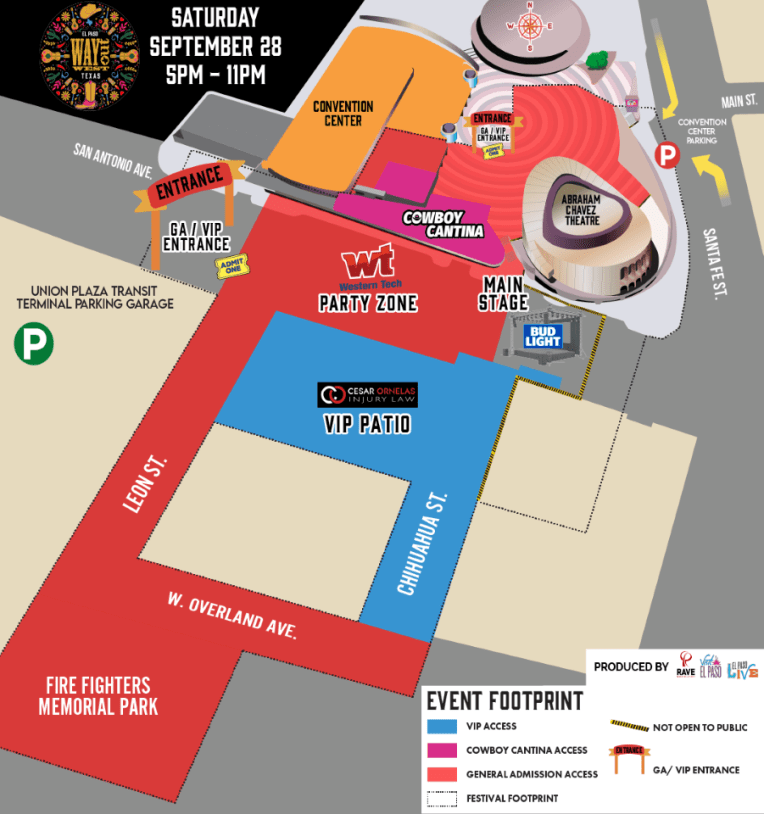 Ahora en su octavo año, WOW Fest reveló que su nuevo festival brindará una expansión significativa para mostrar con éxito la rica historia, las tradiciones únicas y la demanda cada vez mayor de eventos a gran escala como catalizadores económicos de El Paso. La nueva explanada redefinida incluye la plaza al aire libre del Centro de Convenciones de El Paso y cuatro cuadras en las calles circundantes con el escenario principal erigido en la Avenida San Antonio.