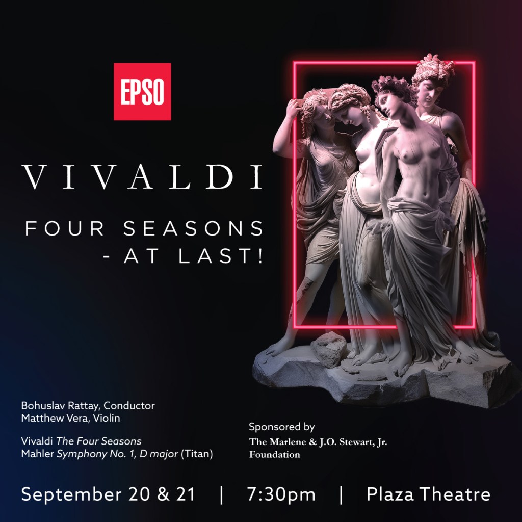 El Paso Symphony Orchestra se complace en abrir la temporada de su 94vo aniversario con “Vivaldi Four Seasons – At Last!”. La primera mitad del programa mostrará los cautivadores sonidos de la obra maestra de Vivaldi, Las cuatro estaciones (primavera, verano, otoño e invierno). Los cuatro conciertos para violín abrieron nuevos caminos con su representación programática de las estaciones cambiantes. El concertino de la EPSO, Matthew Vera, violín, dirigirá la orquesta de cuerdas en esta impresionante pieza de barroco Una persona sentada en un taburete sosteniendo un violín