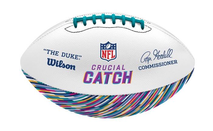 Crucial Catch cobrará vida visualmente en el campo y en el estadio durante los partidos que se activen durante las semanas 4 a 6. Los elementos visuales incluyen balones de juego de Crucial Catch, envolturas para los postes de la portería, pancartas para las paredes del campo y ropa para el campo de juego para jugadores, entrenadores y árbitros. La mercancía de Crucial Catch usada en los partidos se subastará en NFL Auction en NFL.com/Auction. La NFL no obtiene ganancias de la venta de mercancía de Crucial Catch. Las contribuciones caritativas se donan a la Sociedad Estadounidense del Cáncer para apoyar su programa de subvenciones CHANGE.