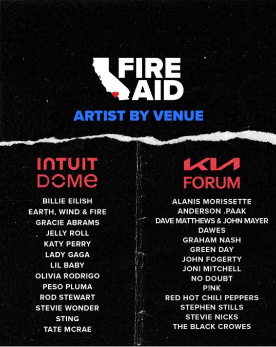 FireAid ha anunciado los carteles oficiales para el 30 de enero con Billie Eilish, Earth, Wind & Fire, Gracie Abrams, Jelly Roll, Katy Perry, Lady Gaga, Lil Baby, Olivia Rodrigo, Peso Pluma, Rod Stewart, Stevie Wonder, Sting y Tate McRae presentándose en el Intuit Dome. Alanis Morissette, Anderson .Paak, Dave Matthews y John Mayer, Dawes, Graham Nash, Green Day, John Fogerty, Joni Mitchell, No Doubt, P!nk, Red Hot Chili Peppers, Stephen Stills, Stevie Nicks y The Black Crowes actuarán en el Kia Forum.
