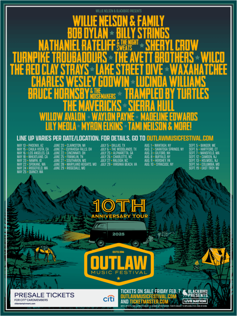 La gira de 2025 será la más grande hasta la fecha, con un cartel incomparable de leyendas y superestrellas, incluyendo a Willie Nelson & Family, Bob Dylan, Billy Strings, Nathaniel Rateliff & The Night Sweats, Sheryl Crow, Turnpike Troubadours, The Avett Brothers, Wilco, The Red Clay Strays, Lake Street Dive, Waxahatchee, Charles Wesley Godwin, Lucinda Williams, Bruce Hornsby & The Noisemakers, Trampled By Turtles, The Mavericks, Sierra Hull, Willow Avalon, Waylon Payne, Madeline Edwards, Lily Meola, Myron Elkins, Tami Neilson y más. Consulta los carteles específicos de cada ciudad a continuación.
