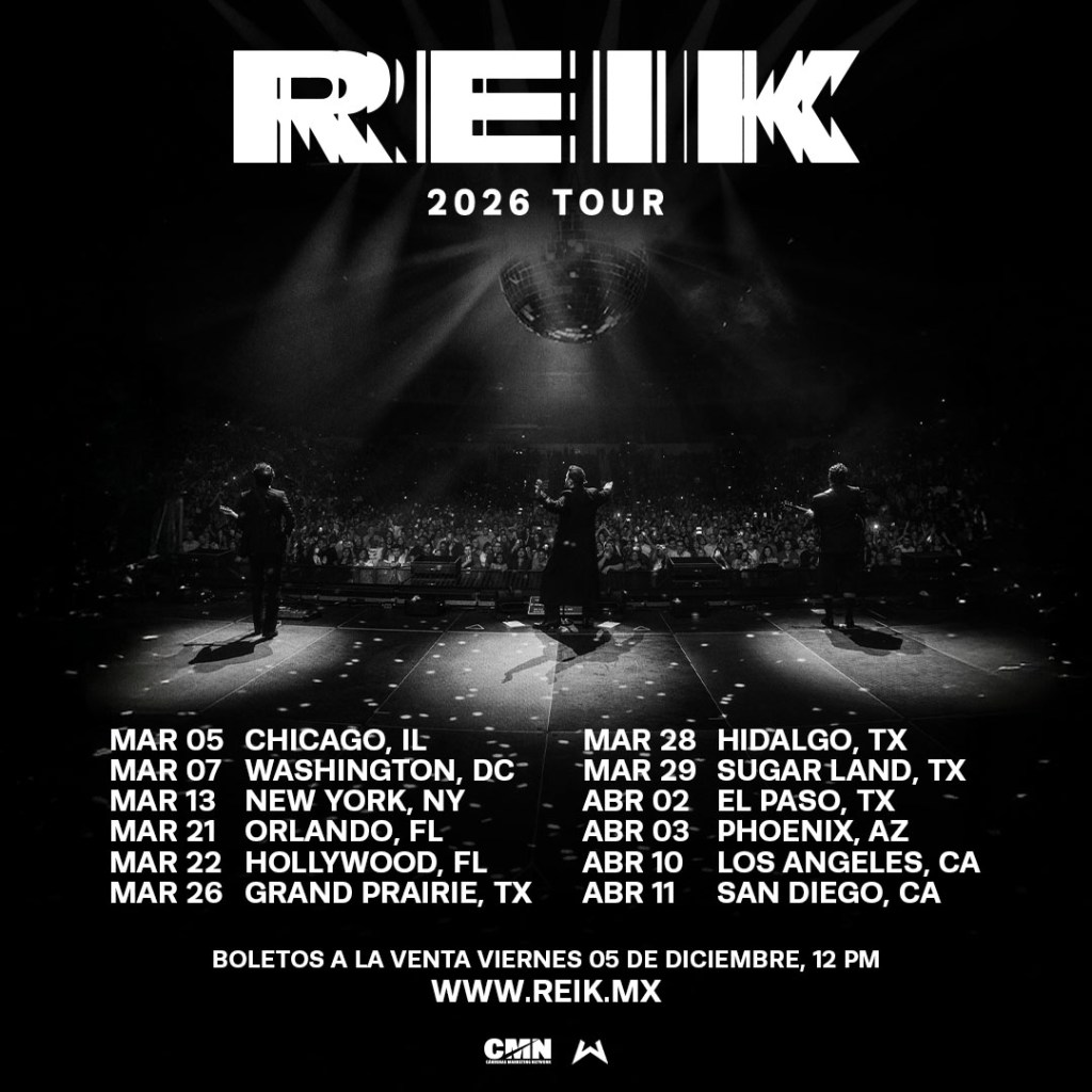 El fenómeno global del pop latino, Reik, anuncia su esperado TOUR 2026 por Estados Unidos, una producción de Cardenas Marketing Network (CMN). La gira arrancará el 5 de marzo de 2026 en Chicago, recorriendo 15 fechas en ciudades clave del país. Entre ellas destaca El Paso, donde la agrupación se presentará el 2 de abril de 2026 en el El Paso County Coliseum, trayendo a la frontera uno de los espectáculos más esperados del año. Esta visita marca un momento especial para los fans de la región, quienes podrán disfrutar de un recorrido musical por los mayores éxitos del trío mexicano junto con nueva música por estrenarse.