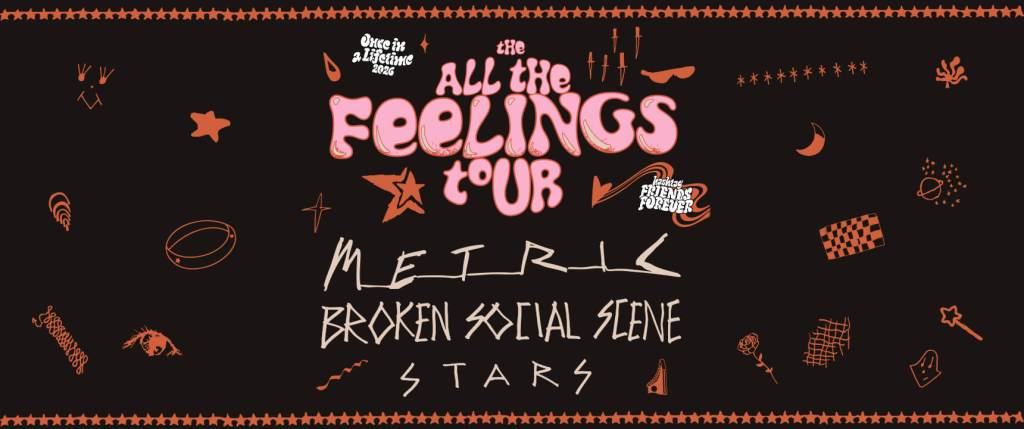 Hoy, las bandas aclamadas y amigas de toda la vida Metric, Broken Social Scene y Stars anunciaron la gira All the Feelings Tour, que llevará su talento colectivo a escenarios de toda Norteamérica este verano. La gira de 18 fechas, promovida por Live Nation, comenzará el lunes 8 de junio en Austin, Texas, en el Moody Amphitheater, y continuará con presentaciones en Dallas, Denver, Phoenix, Bend, Chicago, Boston y más ciudades, antes de concluir con un concierto de regreso a casa en el RBC Amphitheatre en Toronto, Ontario, el viernes 7 de agosto.