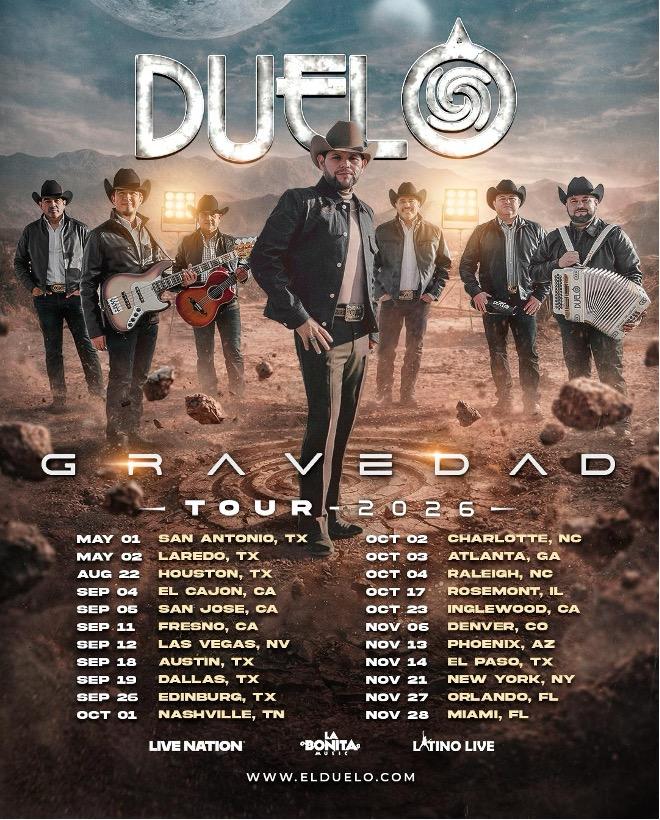Este nuevo capítulo en su trayectoria presenta un espectáculo renovado que potencia su propuesta artística con una puesta en escena impactante y una narrativa musical profundamente conmovedora. Más que una serie de conciertos, “Gravedad Tour 2026” es una celebración del sentimiento que ha definido a la agrupación durante 26 años: esa fuerza invisible que atrae memorias, revive historias y conecta generaciones. A través de esta imponente gira, Duelo honra la esencia del norteño romántico y reafirma la intensidad con la que su música une corazones, despierta emociones y transforma cada noche en un recuerdo imborrable.