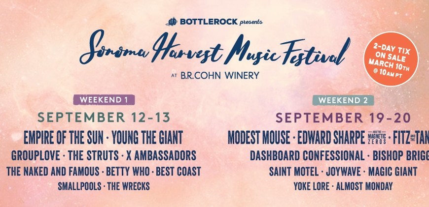 Pre-registration Beat the crowd! Join pre-registration to request Sonoma Harvest Music Festival tickets before they go on sale tomorrow! Click here to pre-register for tickets! Continue reading September’s Sonoma Harvest Music Festival 2020 lineup includes Empire of the Sun, Young the Giant, Modest Mouse, Fitz and The Tantrums and many more!